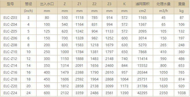 自清洗過濾器ELC-LC-Z 發布時間:2019-03-25 15:09 作者:敘述織夢 來源:未知 點擊: 字號:大中小 技術參數 單臺處理水量:45-2350m³/h 最大工作壓力:0.1-1.6Mpa 過濾器清潔時的壓力損失:≤0.018Mpa 最高工作水溫:95℃ 過濾精度范圍:100-3000μm 自清洗所需水量:<1% 自清洗時間:10-60秒 自清洗控制方式:壓差、時間及手動 電控方式:交流三相380V/ 50Hz 控制界面:數顯、旋鈕、開關 濾網類型:316L編織網、楔形網 尺寸對照表 安裝圖 上一篇:自清洗過濾器ELC-AC-J 下一篇:自清洗過濾器ELC-KC-Y